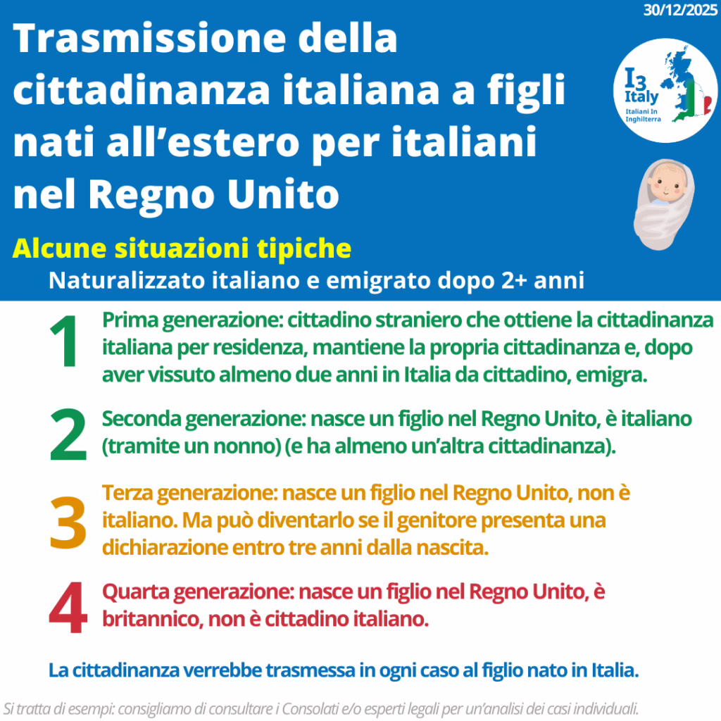 - Chi ha acquisito la cittadinanza italiana ed è emigrato dopo meno di due anni dall’acquisizione ha compromesso il diritto alla cittadinanza dei propri figli, senza aver potuto averne consapevolezza all’epoca della scelta. Questo colpirà le molte comunità etniche presenti nel Regno Unito come gli italo-pakistani, gli italo-bengalesi e gli italo-nigeriani.