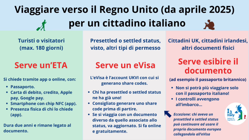L’ETA è richiesto dal 2 aprile 2025, ma comunque non sarà mai richiesto a un residente nel Regno Unito con presettled status, settled status o un visto di qualsiasi tipo. Viene tuttavia richiesto a un cittadino europeo in visita nel Regno Unito. Consigliamo di utilizzare soltanto il sito ufficiale o una delle app ufficiali: attenzione! Il web è pieno di intermediari che si fanno pagare di più per inviare la richiesta per conto vostro. Dal 9 aprile 2025, L’ETA costa £16, non un centesimo di più!