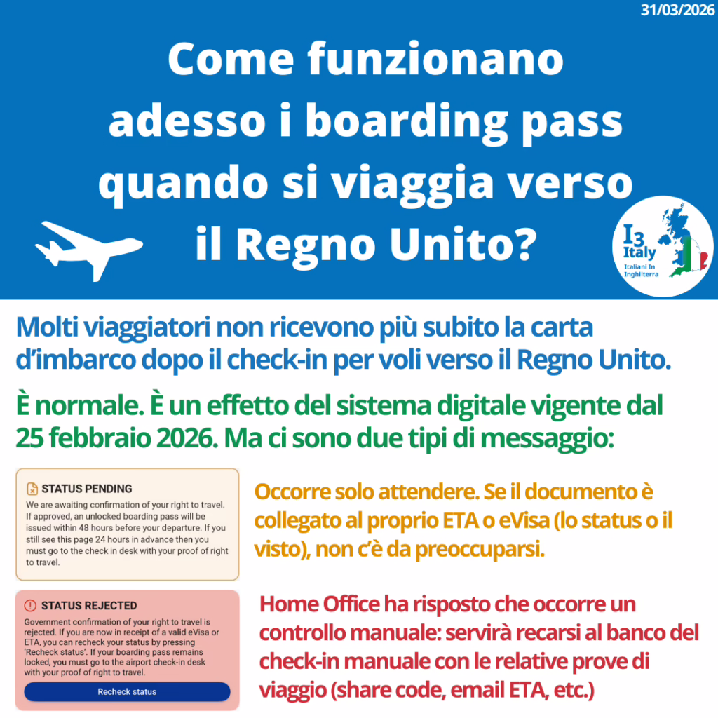 Da vari riscontri, alcune compagnie non usano il sistema digitale e richiedono prove fisiche dell’ETA o eVisa, ma legalmente queste prove non esistono. Anche gli share codes andrebbero verificati sul portale ufficiale dalla compagnia aerea per essere validi. Home Office ha una helpline per i carriers che può autorizzare l’imbarco in casi eccezionali, ma alcune compagnie aeree non ne sono a conoscenza e rifiutano di chiamarla. Con il tempo, le cose miglioreranno e le compagnie aeree conosceranno meglio le nuove procedure… ma per chi viaggia in questo periodo è importante essere informati per difendere i propri diritti.